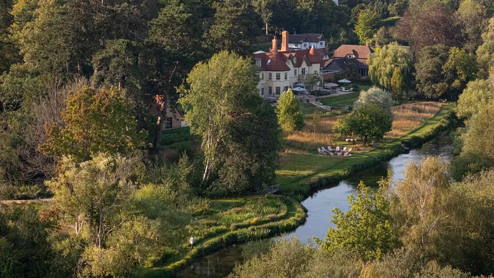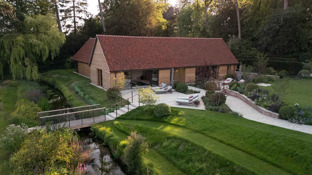 Sprawling across 28 private acres in the heart of Hampshire’s Test Valley, the grounds at Freelands are as much a part of the experience as the house itself. The estate sits directly on the River Test—one of England’s most celebrated chalk streams—in the region where modern dry-fly fishing was born, with a private half-mile riverbank winding through meadows and woodlands. A three-acre, still-water, spring-fed lake sits further into the grounds and is also available for fishing as well as wild swimming in its crystal-clear water. Across the estate, you’ll also find fishing huts and two miles of scenic paths that wind around the property past Freelands’ serene waterways.
